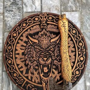 Handcrafted Viking Fenrir Shield 24'' & Engraved Axe Set | Norse Decor
