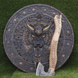 Handcrafted Viking Fenrir Shield 24” & Engraved Axe Set | Norse Decor