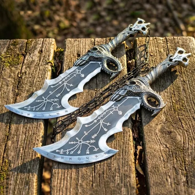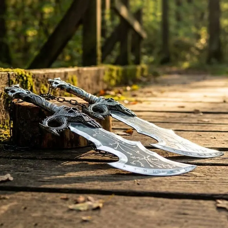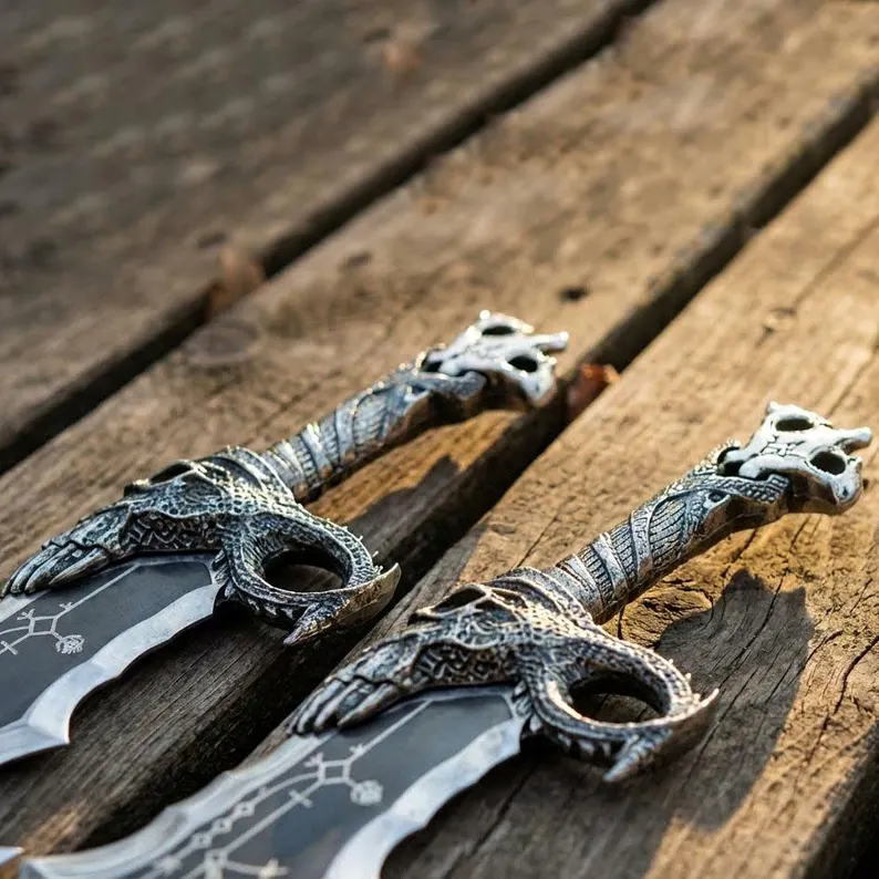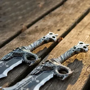 Each twin blade is hand-forged by skilled artisans, offering an authentic and highly detailed look for cosplay, home décor, or collectors’ displays. This set also includes a custom wall mount, allowing you to showcase the blades as a dramatic centerpiece in your game room, man cave, or display wall.