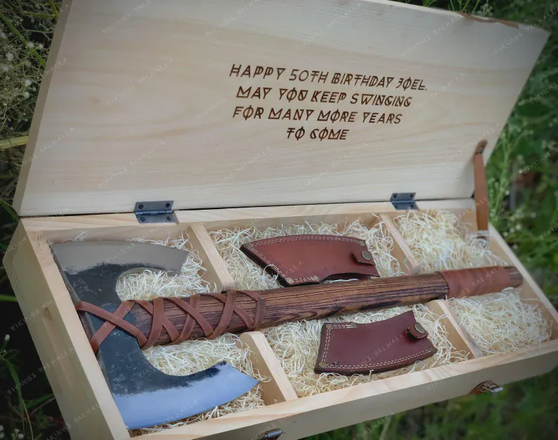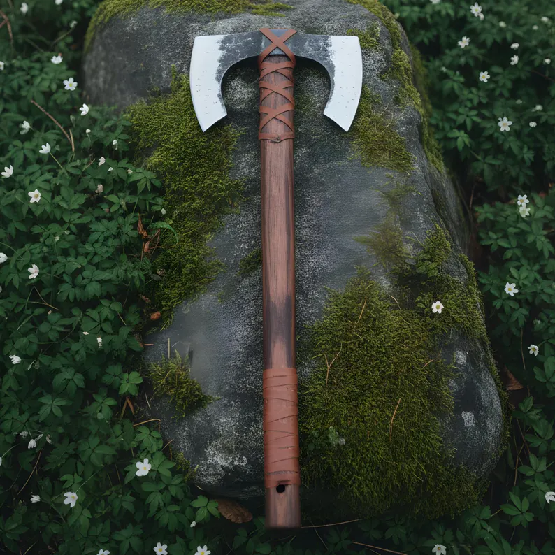 Honor the warrior spirit with this hand-crafted Viking double-headed axe, inspired by Norse legends and built to last a lifetime. Each axe is individually forged and hand-finished, featuring a razor-sharp high-carbon steel blade and a solid hardwood handle wrapped in premium leather for comfort and grip.