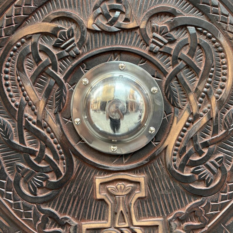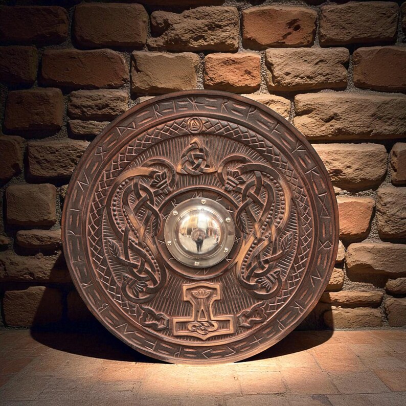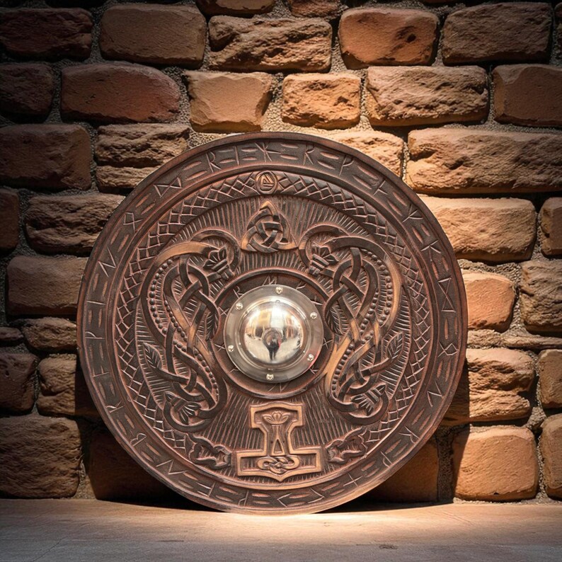 Step into the age of warriors with this handcrafted Viking Round Shield, designed with intricate Norse carvings and runic patterns. Perfect for cosplay, reenactments, LARP battles, or as a stunning wall display piece, this shield embodies the strength and artistry of the Viking age.