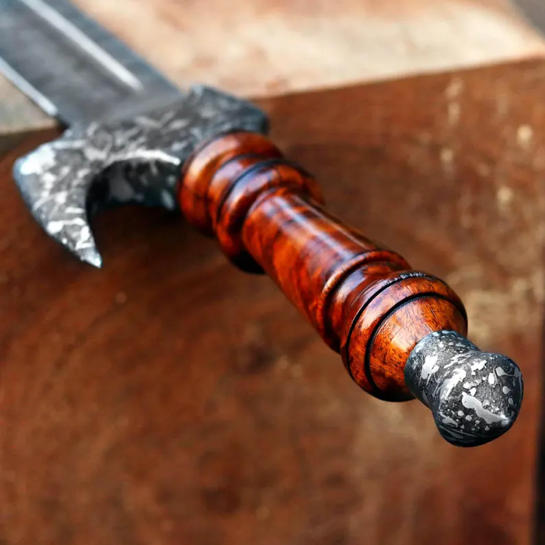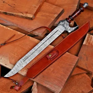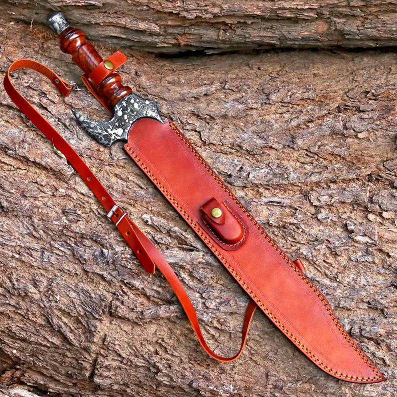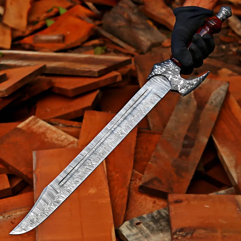 🔹 Material Options: damascus with Die cast hand guard + wood grip + wire on handle with Sheath made of leather