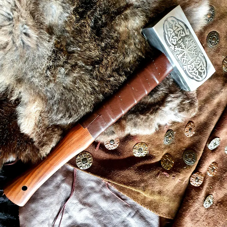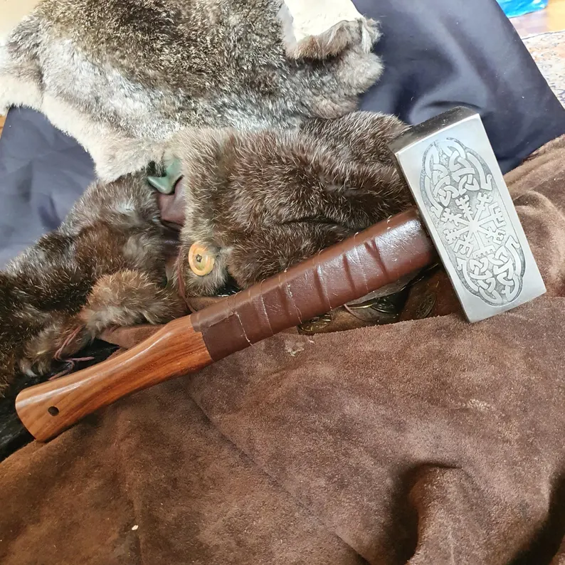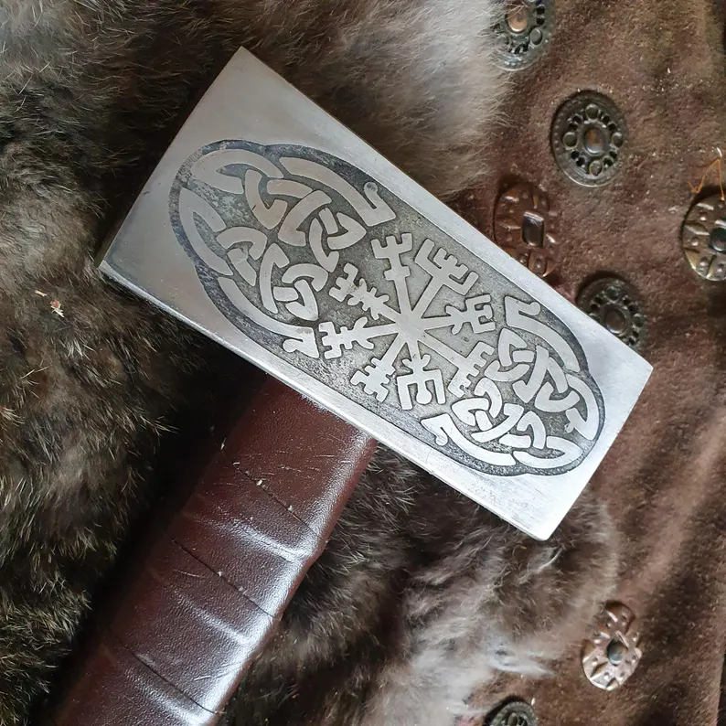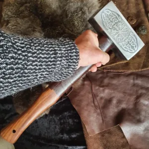 Additionally, the hammer head has deeply etched Viking motifs and runes on both sides.