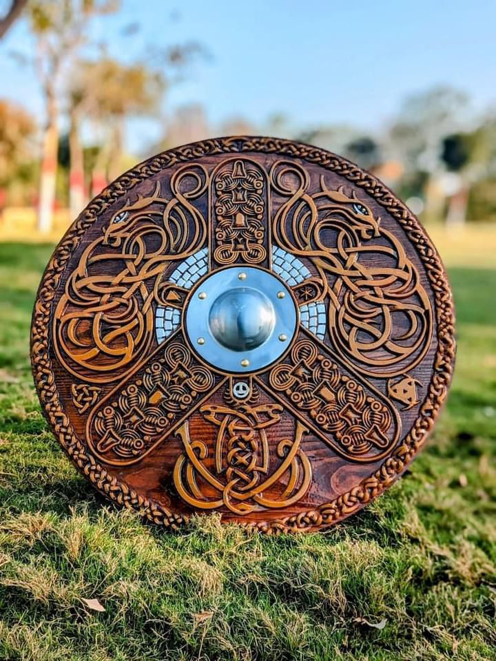 Visually, such shields often evoke Norse themes: bold colors (reds, blues, blacks, natural wood tones), stylized animal motifs (wolves, dragons, ravens), knotwork, runic elements, and a central boss. The center boss (a raised dome) often is metal and gives the shield an iconic silhouette.