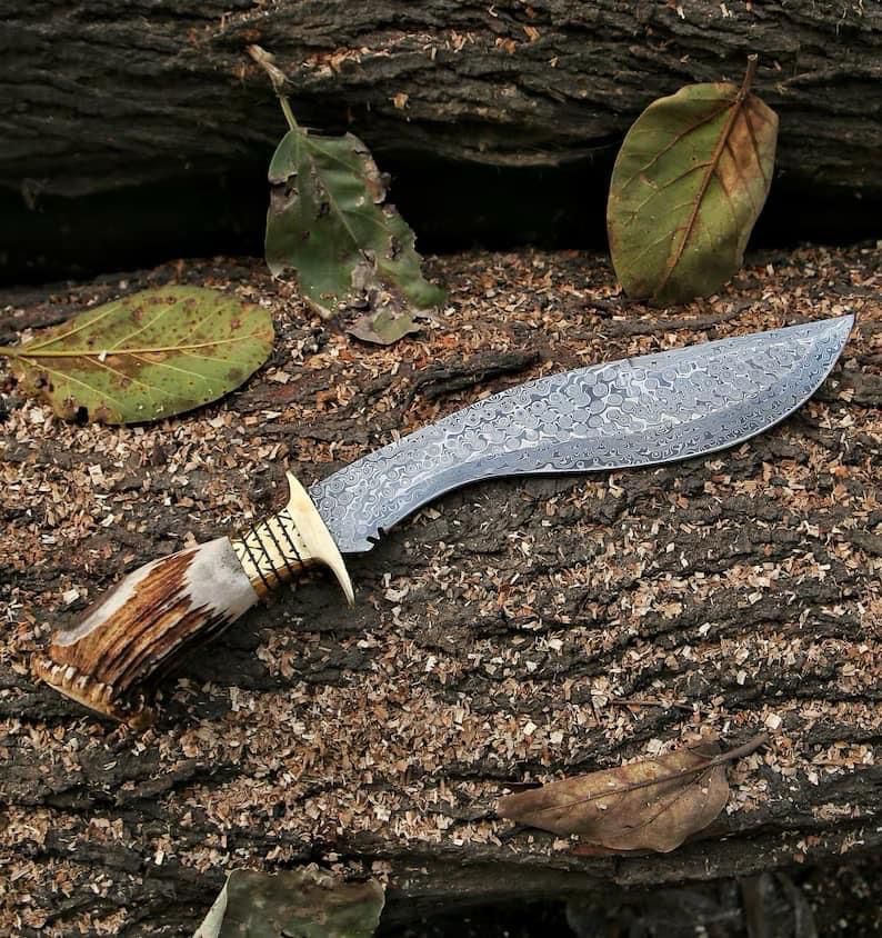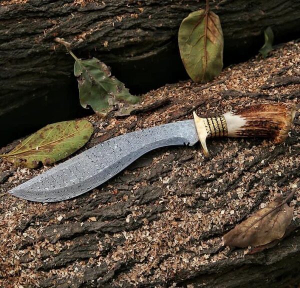 The handle is ergonomically shaped for a secure grip, made from durable materials like hardwood, bone, or textured composite—designed to feel natural in the hand even in the harshest conditions. Subtle engravings or carved patterns may adorn the handle or blade, adding both character and cultural weight.
