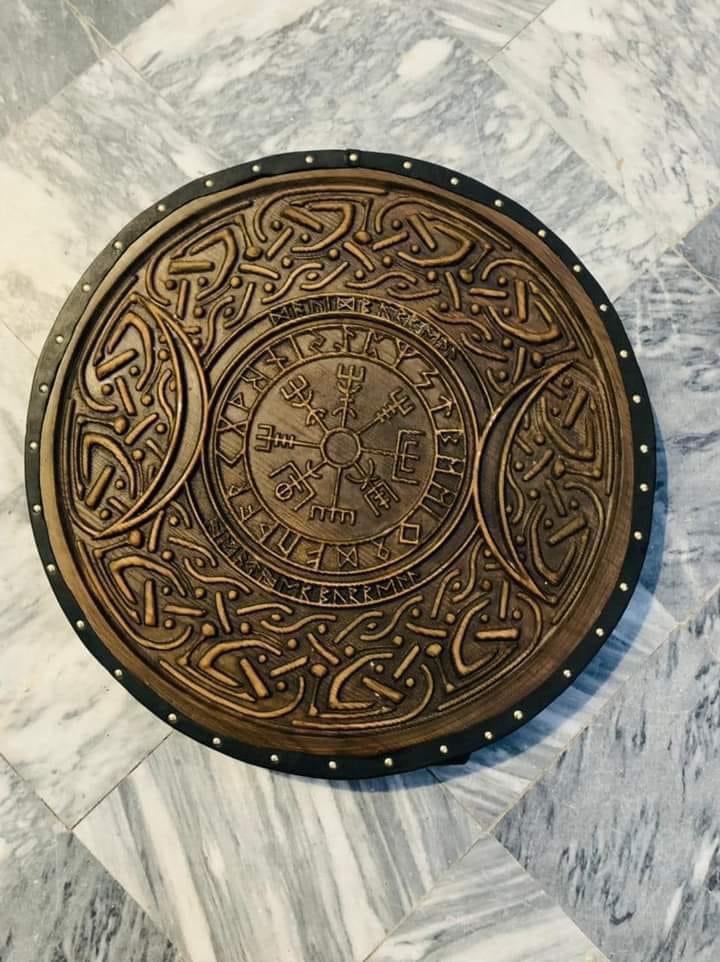 An 18″ Viking shield is a relatively small round shield, often used for decorative, cosplay, LARP, or display purposes rather than full battle reenactment (though lighter combat styles may still use it). The compact size gives it a striking look and makes it easier to handle or mount on a wall.